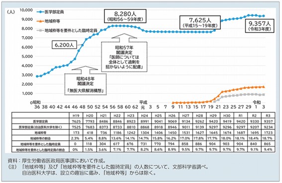 上図の全国の医学部入学定員の推移を確認すると、医学部の入学定員は、2000年代は7,625人で、2021年は9,357人で、増加率は約22%に留まっています。